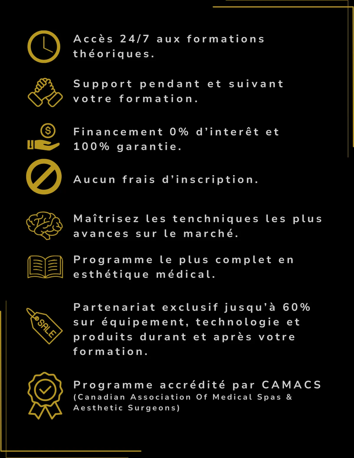-Supervision experte: Les élèves seront encadrés par des instructeurs expérimentés et qualifiés dans le domaine de l'esthétique médicale. Ces professionnels partageront leurs connaissances et leur expertise tout au long de la formation.